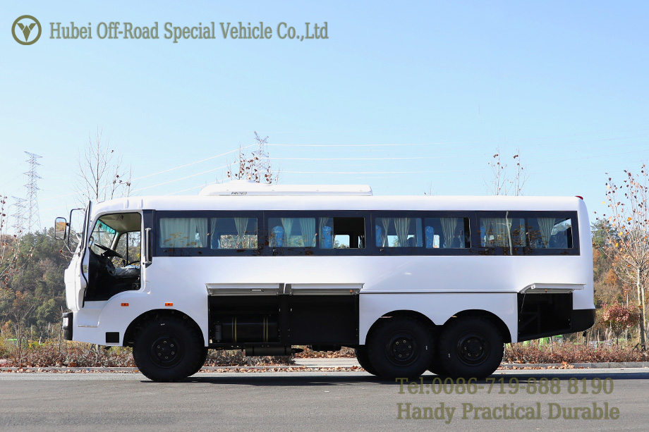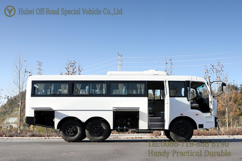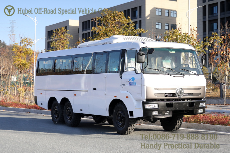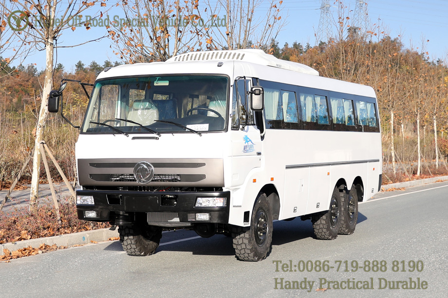 ລົດເມ 6WD Off-road ໃຊ້ Dongfeng classic off-road chassis, ປະສິດທິພາບ off-road ດີກວ່າ, ສາມາດເດີນທາງໃນສະພາບຖະຫນົນຫົນທາງທີ່ບໍ່ດີ, ເຫມາະສໍາລັບການຊ່ວຍເຫຼືອກູ້ໄພໄພພິບັດ, ການກໍ່ສ້າງຖະຫນົນຫົນທາງ, ການຂົນສົ່ງວັດສະດຸ, ແລະອື່ນໆ.